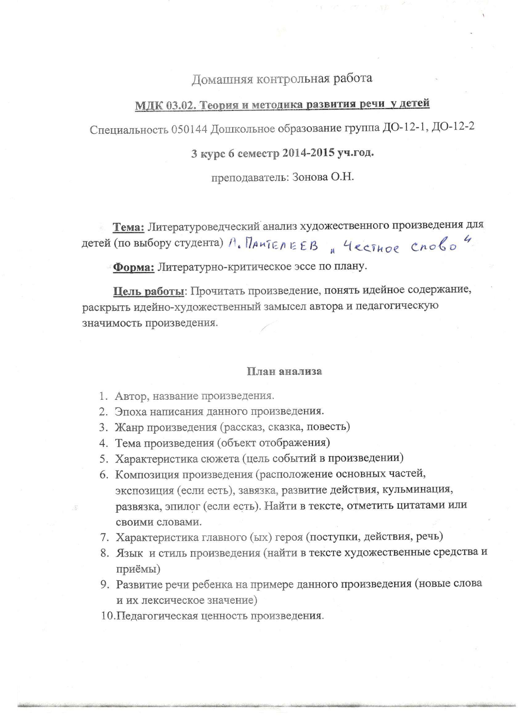 Литературоведческий анализ художественного произведения для детей Н. Пантелеева "Честное слово" |